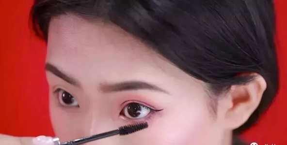 用眼线笔,填充睫毛根部画好内眼线,并画一个略微上扬的眼尾。用睫毛膏,刷出浓密的睫毛。
